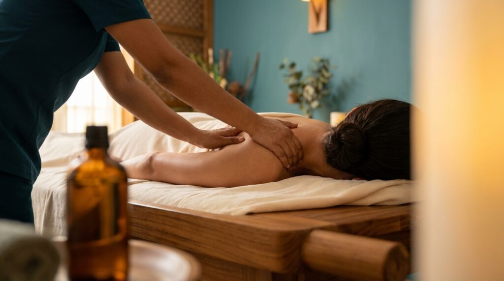 Your therapist will begin with a brief consultation — where is your tension concentrated, is there any specific injury history, what’s your pressure tolerance. Be specific here. Tell them about the right shoulder. Tell them about the neck. The more precise you are, the more targeted the work will be.