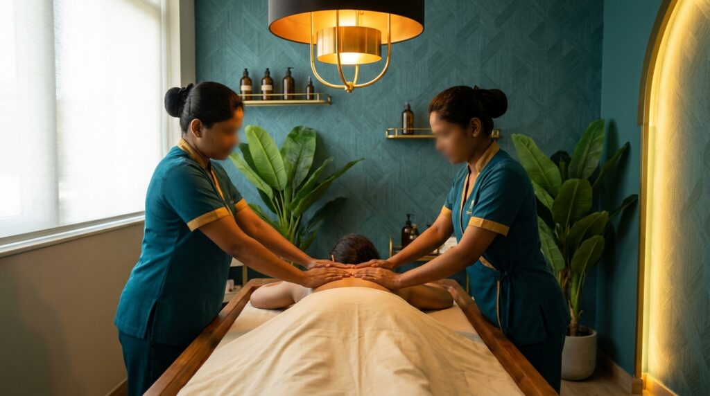 The Four-Hand Massage at Indriya Wellness is 45 minutes. Two therapists. Perfectly synchronised movements applied simultaneously across both sides of the body. Priced at ₹2,800.
